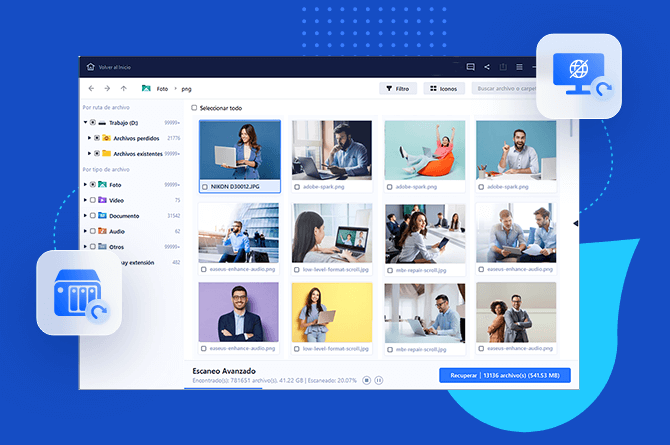 Recupera sin límite los datos, imágenes, documentos y vídeos perdidos del disco duro, SSD, unidad flash, RAID, NAS, etc. con una tasa de éxito del 99,9%.