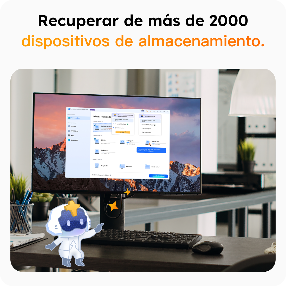 EaseUS Data Recovery Wizard está aquí para apoyarle en cada paso de su proceso de recuperación de NAS y Linx. Desde tarjetas SD hasta discos duros externos o almacenamiento en red, nuestras herramientas están diseñadas para simplificar la recuperación de datos perdidos, brindándole tranquilidad mientras recupera sus archivos perdidos.